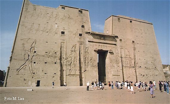 Questo tempio, dedicato ad Horus, è di epoca tolemaica ed è straordinariamente benconservato. Il pilone principale, di Tolomeo XIII, domina il resto del tempio, con i suoi due parallelepipedi trapezoidali uniti dall'architrave della porta. | |||||